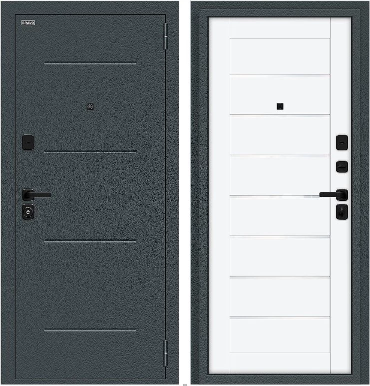 Надежная входная Дверь Браво Техно/SBlack Старк антрацит/White Silk премиум класса по цене 36 149 руб. Большая толщина стали защитит от проникновения в ваш дом, квартиру или коттедж. Используется очень качественная фурнитура: замки, цилиндры, ручки, защелки. Покрытие и отделка двери изготовлено под внимательным контролем производителя. Дверь имеет долгий срок службы и гарантию.